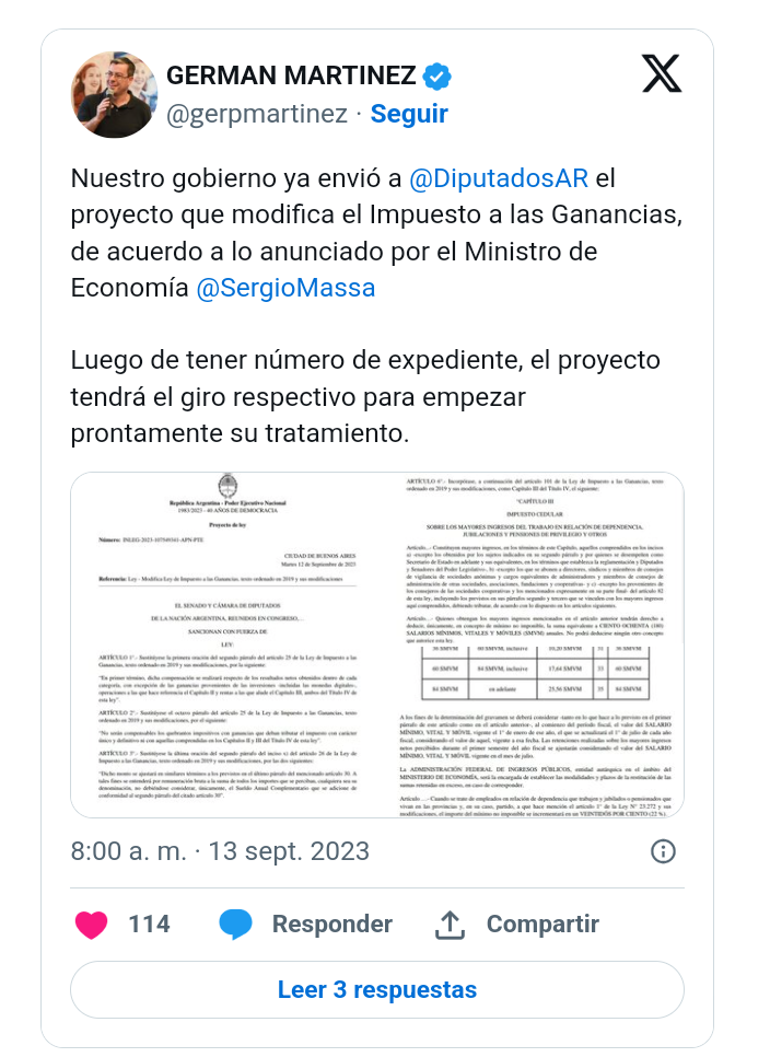 El proyecto del Poder Ejecutivo para modificar el impuesto a las Ganancias, anunciado por el ministro de Economía y candidato presidencial de Unión por la Patria (UxP), Sergio Massa, ingresó este miércoles a la Cámara de Diputados.