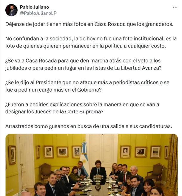 “¿Se va a Casa Rosada para que den marcha atrás con el veto a los jubilados o para pedir un lugar en las listas de La Libertad Avanza? ¿Se le dijo al Presidente que no ataque más a periodistas críticos o se fue a pedir un cargo más en el Gobierno? ¿Fueron a pedirles explicaciones sobre la manera en que se van a designar los Jueces de la Corte Suprema?”, se preguntó el radical opositor.