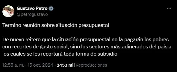 Eran cerca de la 1 am (23hs Argentina) cuando Petro hizo sus declaraciones tras finalizar una reunión de gabinete: “De nuevo reitero que la situación presupuestal no la pagarán los pobres con recortes de gasto social, sino los sectores más adinerados del país a los cuales se les recortará toda forma de subsidio”, escribió en la red social X, ex Twitter. Aún así, desde el Ejecutivo siguen revisando cuáles son las opciones que tiene el país para poder contar con una hoja de ruta de gastos e ingresos luego de que el Congreso rechazara la iniciativa de la ley de financiamiento que el Ejecutivo presentó por 523 billones de pesos colombianos (123 mil millones de dólares), con un recorte de 12 billones de pesos colombianos -que fue criticado por opositores como por sectores empresariales-.