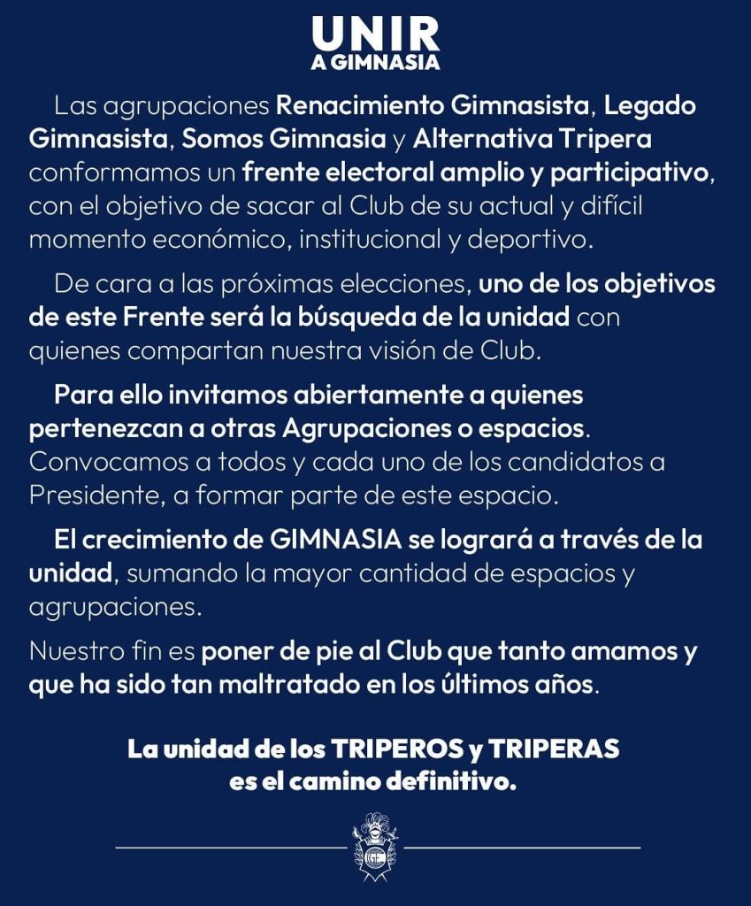 Bajo la consigna Unir a Gimnasia, el nuevo frente confirmado por Emanuel Di Loreto, Diego Patiño, Juan Larraza y Lucas Castagneto, realizó un comunicado en las redes sociales, donde expresó “la búsqueda de la unidad con quienes compartan nuestra visión de Club”.